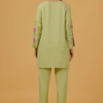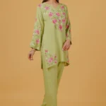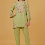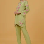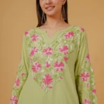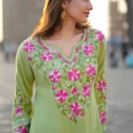 Fresh, elegant, and effortlessly graceful, this Chikankari embroidered kurta is crafted from soft, breathable rayon, offering a fluid drape and all-day comfort. Set in a soothing Pista green hue, the kurta is adorned with intricate pink and ivory Chikankari floral embroidery across the neckline, yoke, sleeves, and hem, creating a beautiful contrast that feels both vibrant and refined.