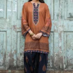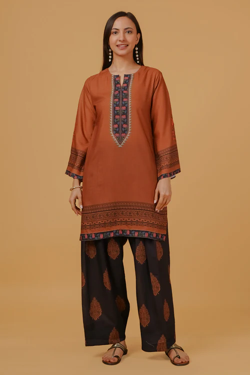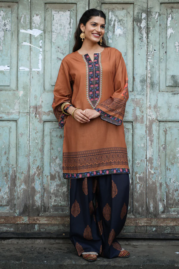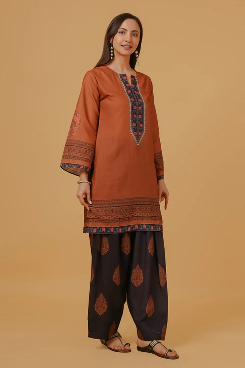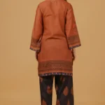 Effortlessly elegant with a touch of tradition, this printed co-ord set is crafted in breathable lawn cotton and features a beautifully hand-designed digital print inspired by classic Indian motifs. The rich cocoa brown kurta is highlighted with an intricately printed central panel and coordinated border detailing, paired with contrasting deep navy Farsi bottoms adorned with delicate paisley prints.