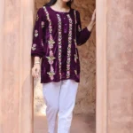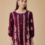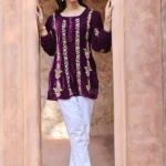 Rich, cozy, and effortlessly stylish – this Wine Velvet Chikankari Kurti from House of Kari is designed for winter elegance. Crafted in plush velvet fabric, the 30-inch kurti brings a chic shorter length perfect for pairing with denims, leggings, or palazzos. The round neckline with buttoned detailing is highlighted by vertical panels of delicate floral chikankari embroidery in soft pinks and greens, adding both charm and refinement. With gathered sleeves and a relaxed fit, this kurti is ideal for festive gatherings or casual winter outings, blending luxurious velvet warmth with timeless hand embroidery.